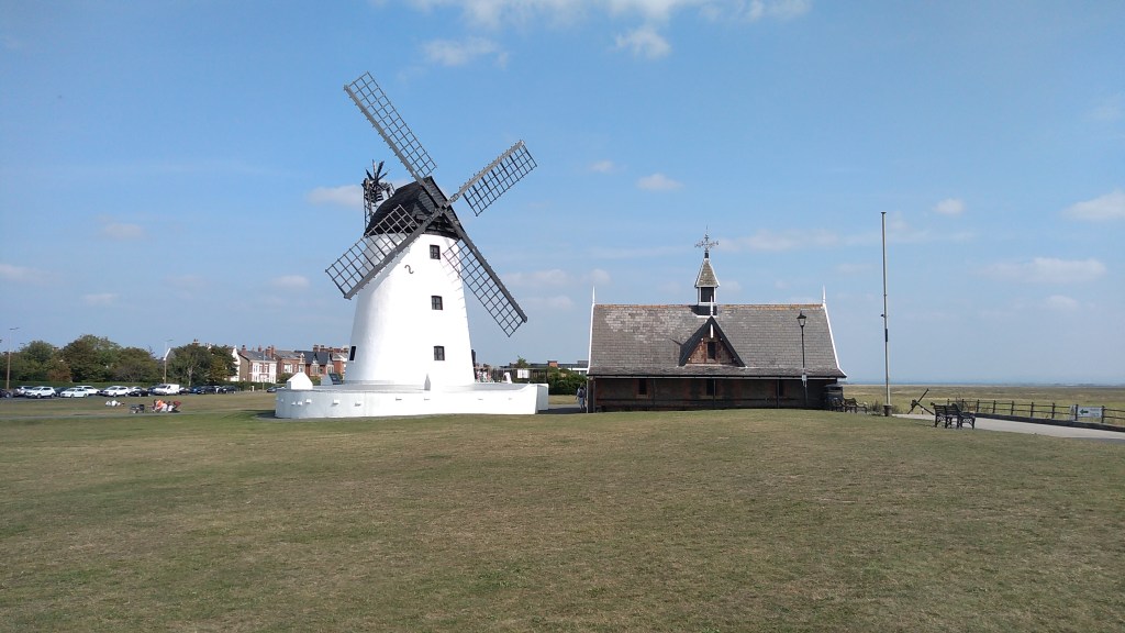 I’m sat on the Green a broad strip of grass that separates the town from the sea. As well as being a green lung for the town and the surrounding area, it also functions as an events space for the Lytham Festival and other shows. Standing proud at one end is the Windmill. Glowing white in today’s autumn sunshine.