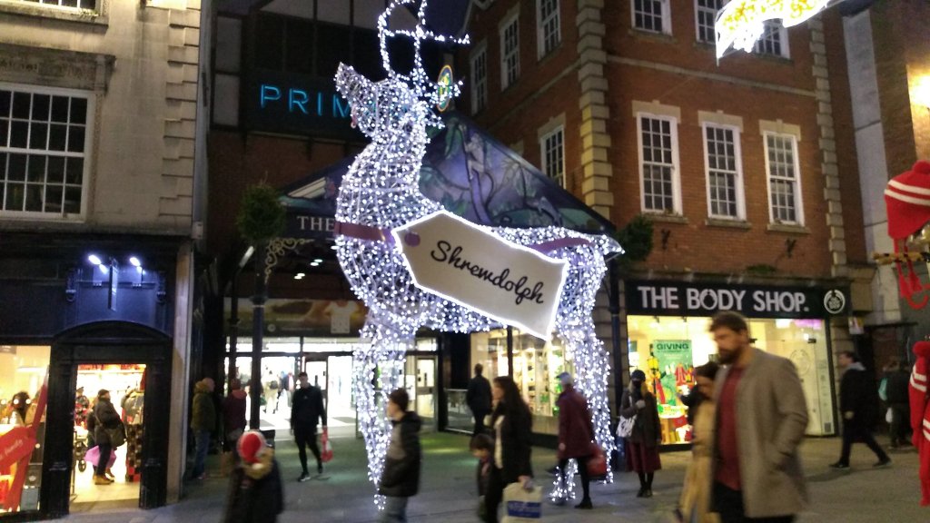 I wanted to see the town in it’s Christmas finery, there was a display down Pride Hill to the market hall and the Square was lit up with the stalls of a Christmas market.