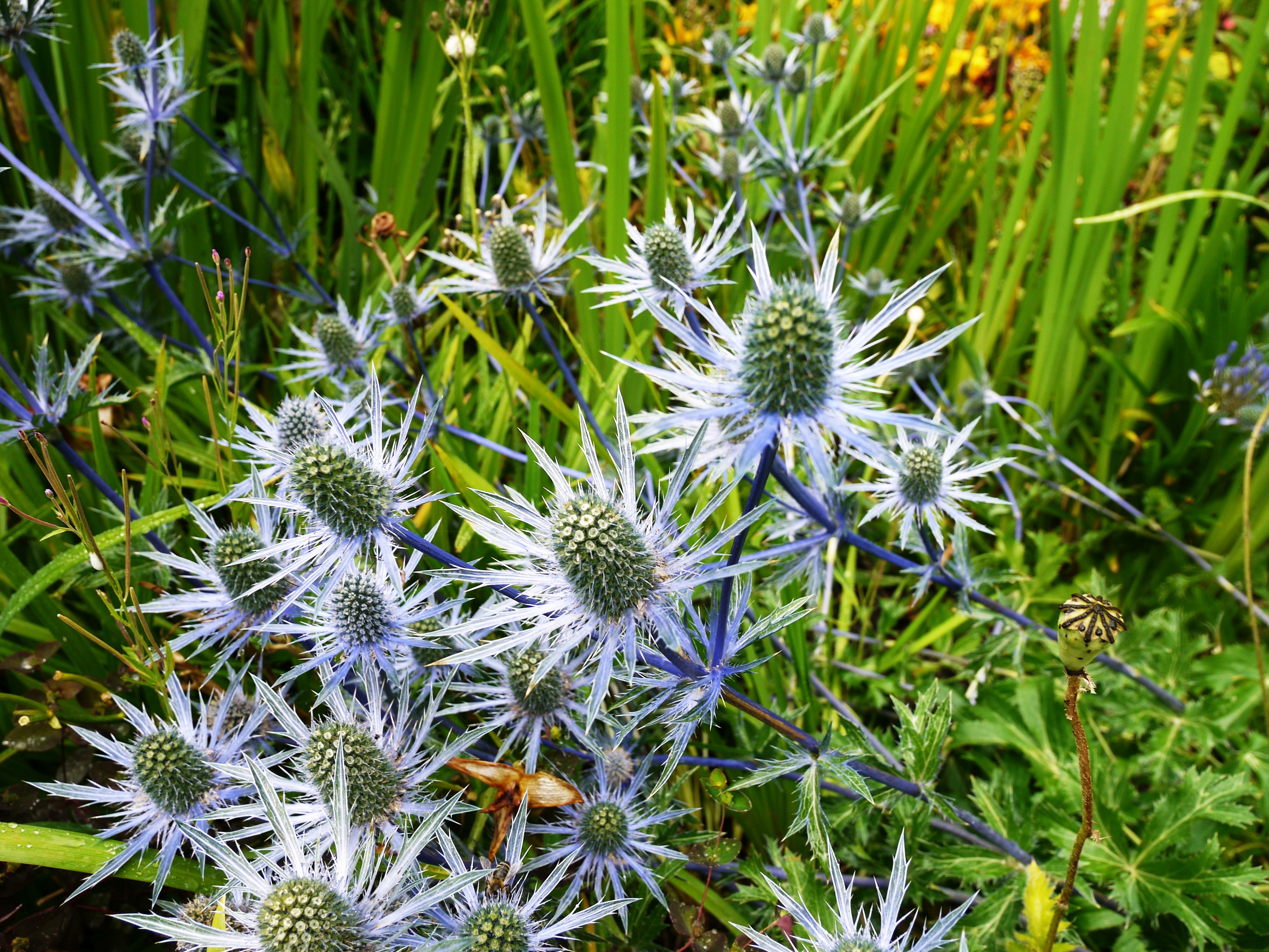 While I’m not a great fan of getting wet there is sometimes a bit of magic to be had walking amongst the flowers on a rainy day. A recent visit to Keswick in the English Lake District was on a day that was damp around the edges to say the least. It didn’t seem to worry the tourists that were thronging the main street and the Saturday market as I made my way through from the bust stops by the Booths Supermarket and up to Lake Road and the lake. I was heading for the Derwentwater shore, the crowds tend to thin out there, the green vastness of the woodlands and shores out that way absorb the numbers of people and have a beautiful calming effect. Just before the Theatre By The Lake you pass by Hope Park an area of gardens gifted to the town in the 1970’s, it’s a clutch of paths and ornamental flowerbeds burbled through with a narrow stream, there’s a crazy golf course there, a few hardy souls were perfecting their technique as the drizzle absently drifted down. I took a couple of shots of the flowers and foliage before dawdling on my way to the lake, past the ice cream shop. Well you know, I don’t want to get too thin and healthy.