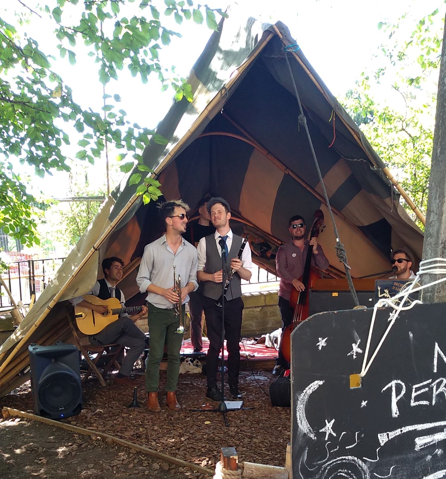 I had a fish and chips lunch on the West Port, it leads down to the Grassmarket, washed them down with a crisp and cool glass of cider, then it was out again into the sunshine and the Fringe. The Meadows, just to the south of the city centre are another favourite location. The walk down from Bristo Square under the trees is a great location for acts I came across The Easy Rollers, a jazz band who model themselves on the 1920’s and good they are too.