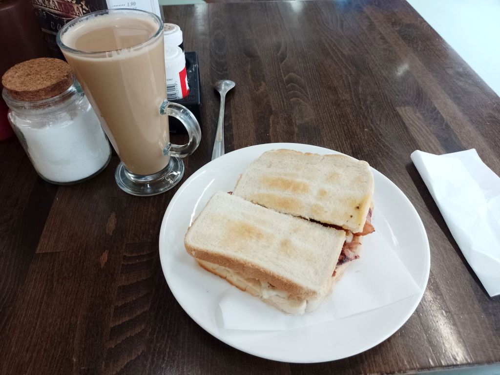 The new hall is still in building but parts of the present market are already being closed off, slice by slice, It’s easy to replace a building but harder to relocate the spirit of a place. Anyway I had a walk around and I was getting into a Fat Rat mood. One of the things I like about a market are the cafes, the information centrals that give life and an energy to the place. Events and people are weighed and measured, verdicts are passed, and there’s food too. I went for the cheese and bacon butty at the Alexandra Cafe, good it was too.