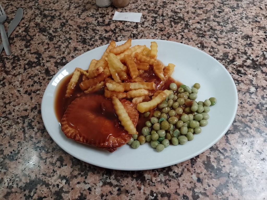 The skies closed in and the weather went into the “unfriendly” setting. It was bearable for a while but it got boring dodging from dry spot to dry spot. I felt I needed some internal insulation and went in search of food. Something filling, it wasn’t salad weather.