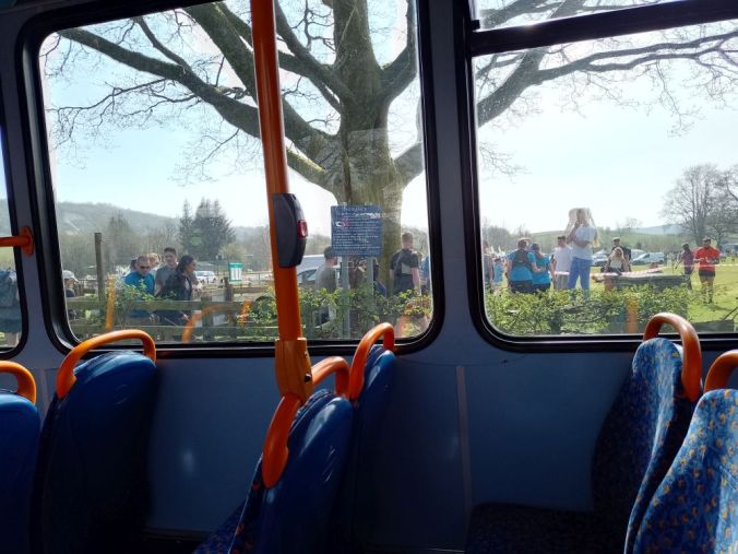 The route is one that’s more like a fairground ride than a bus ride. Up down, side to side, along lanes that are big enough for the bus but not much else. The route takes you through Hawkshead, where a fell running race was in progress, a trail of matchstick figures could be seen making their way down from the heights, eyes focussed, every step measured.
