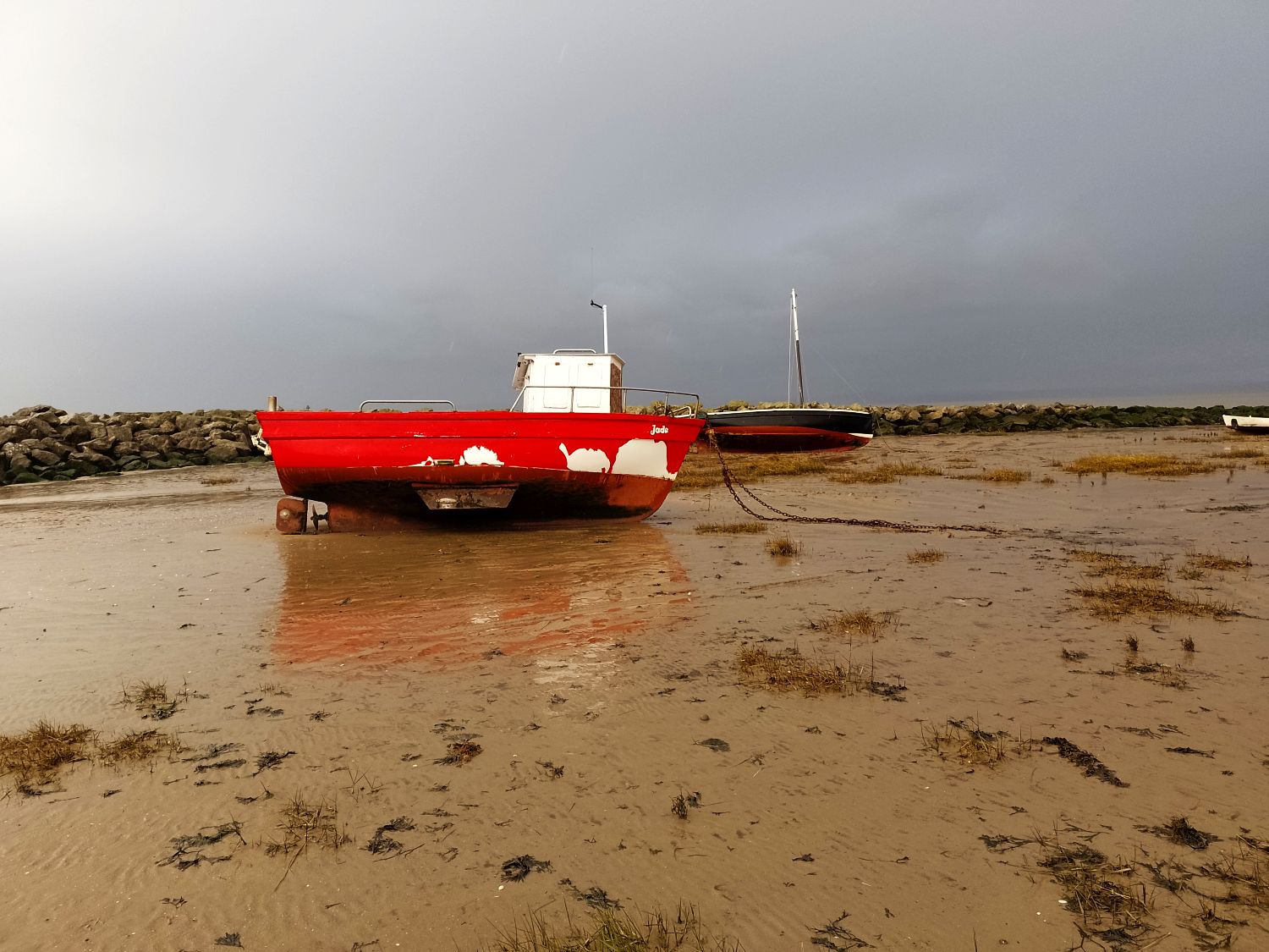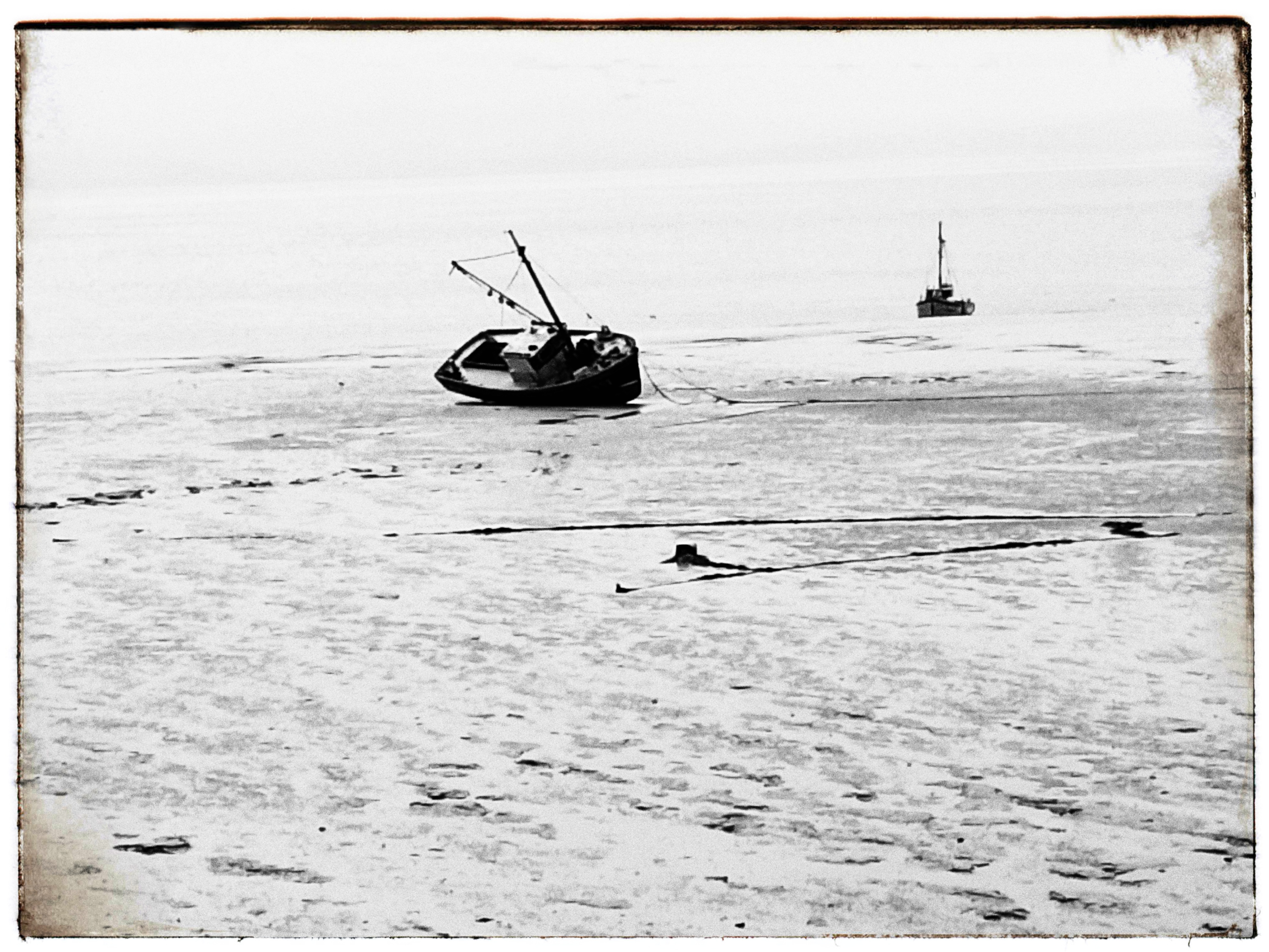 The boats wait the return of the tides on a gey day on Morecambe Bay.